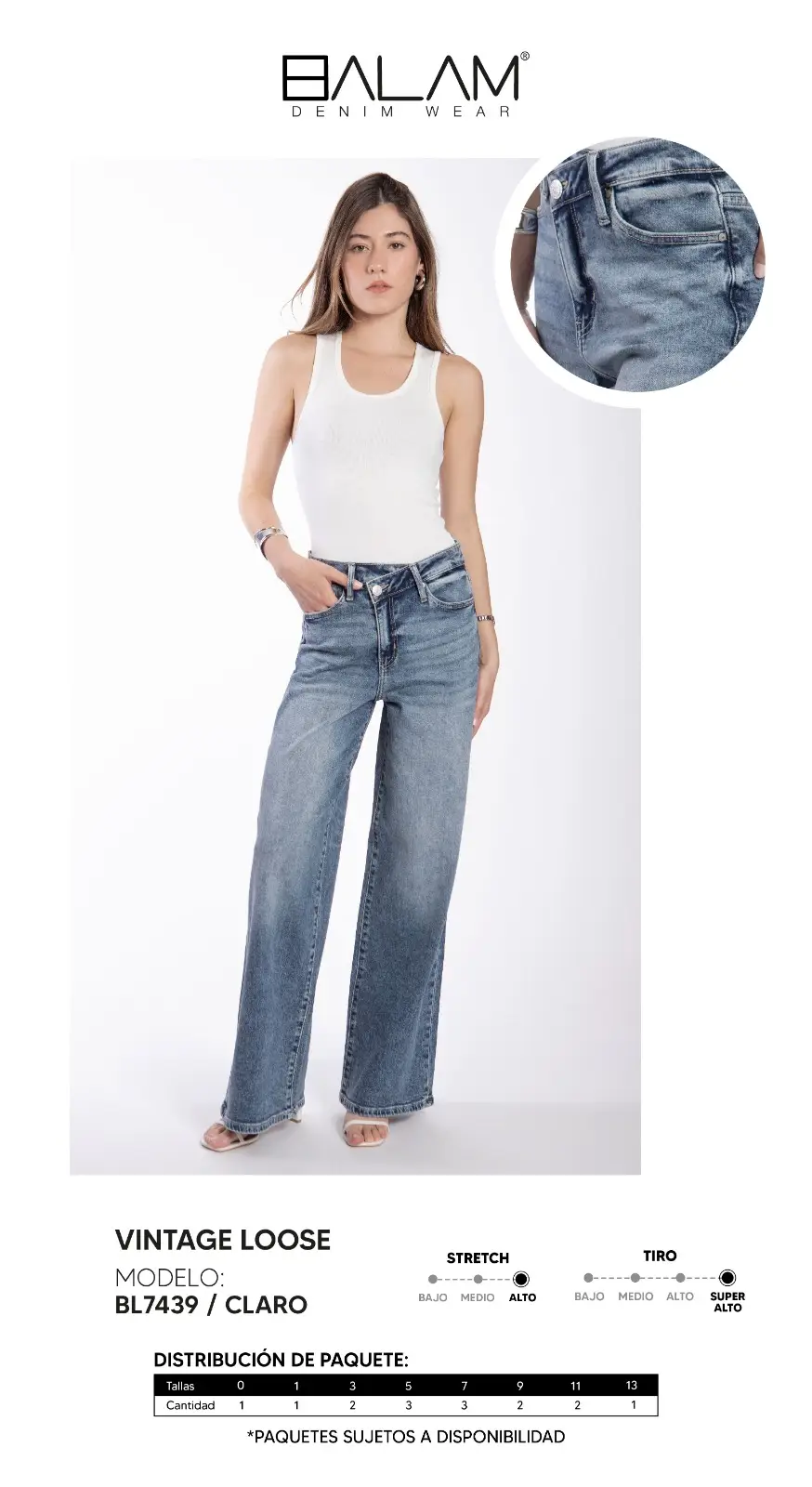 Jeans Balam Vintage Loose BL7439 / Claro Dale un toque relajado y moderno a tu outfit con este jean de estilo vintage loose. Su corte amplio y tiro súper alto estiliza la figura y brinda máxima comodidad durante todo el día. Confeccionado en mezclilla suave con stretch alto, se adapta perfectamente al cuerpo sin perder su forma. Su lavado claro con efecto desgastado le aporta un look casual y versátil, ideal para combinar con básicos o prendas más sofisticadas. Perfecto para quienes buscan comodidad sin sacrificar estilo