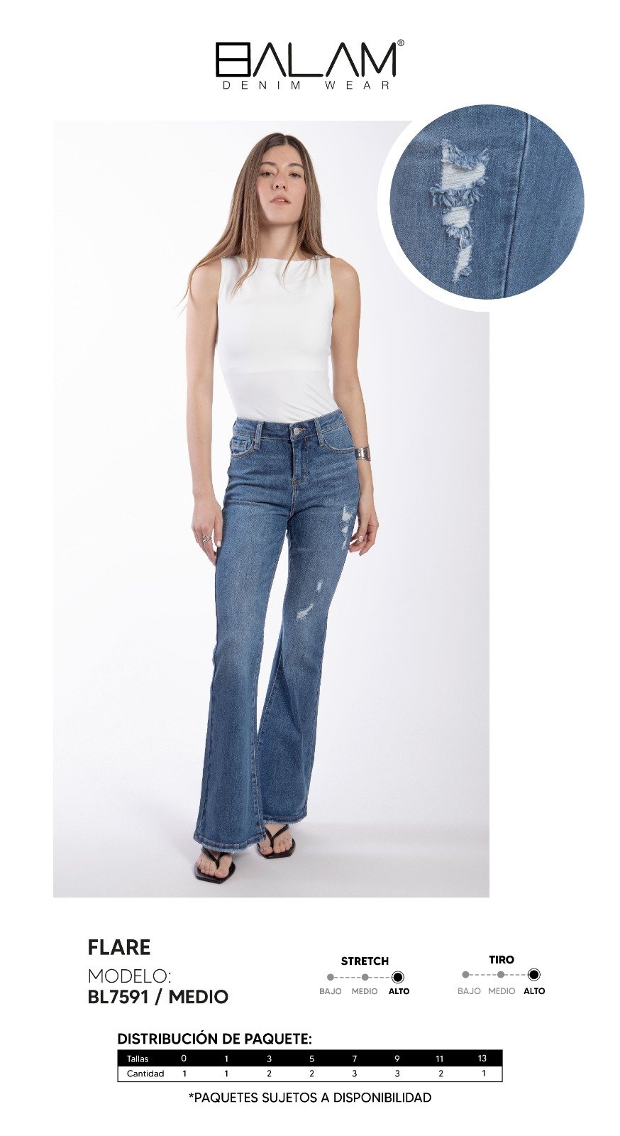 Jeans balam Flare BL7591 Campana – Tono Medio  Eleva tu estilo con este jean flare de silueta favorecedora, diseñado para alargar visualmente la figura y aportar un toque moderno y femenino. Su tono medio lo convierte en una prenda versátil, ideal para combinar tanto con looks casuales como más sofisticados. Confeccionado en mezclilla con alto nivel de stretch, brinda un ajuste cómodo que se adapta perfectamente al cuerpo, resaltando la silueta sin sacrificar libertad de movimiento. Presenta detalles desgastados sutiles que añaden un aire contemporáneo y desenfadado. Su tiro alto estiliza la cintura, mientras que la abertura tipo flare desde…
