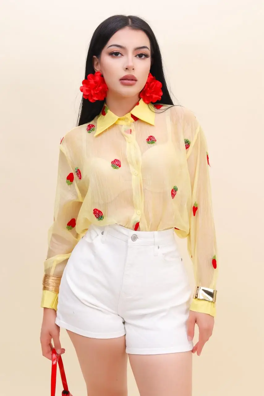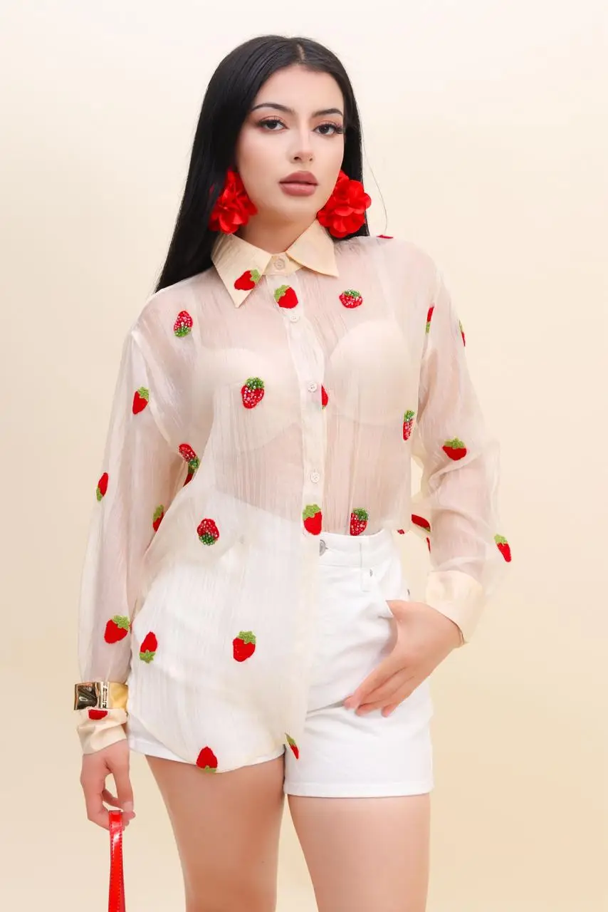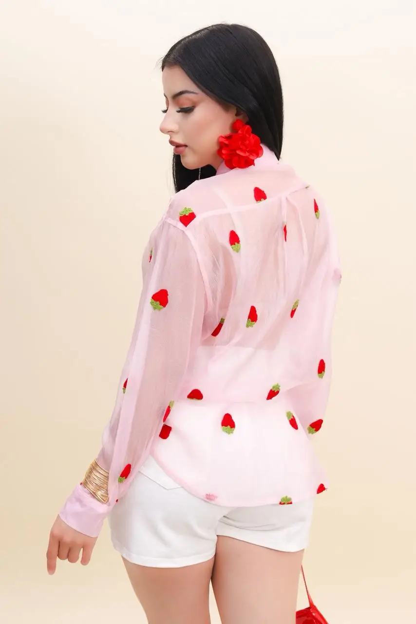 CAMISA HSL4776 DE GASA CON FRESAS EN PEDRERIA Blusa femenina de diseño fresco y encantador, perfecta para destacar con un estilo delicado y moderno. Confeccionada en tela ligera y semitransparente, presenta un elegante que resalta su original estampado de fresas bordadas Y pedreria, aportando un toque divertido y sofisticado al mismo tiempo. Cuenta con cuello clásico tipo camisero, cierre frontal con botones y mangas largas con puño ajustado, ideal para lograr un look pulido. Su silueta ligera permite combinarla fácilmente con prendas de tiro alto, como shorts o pantalones, creando outfits versátiles para el día o la noche. Una prenda…
