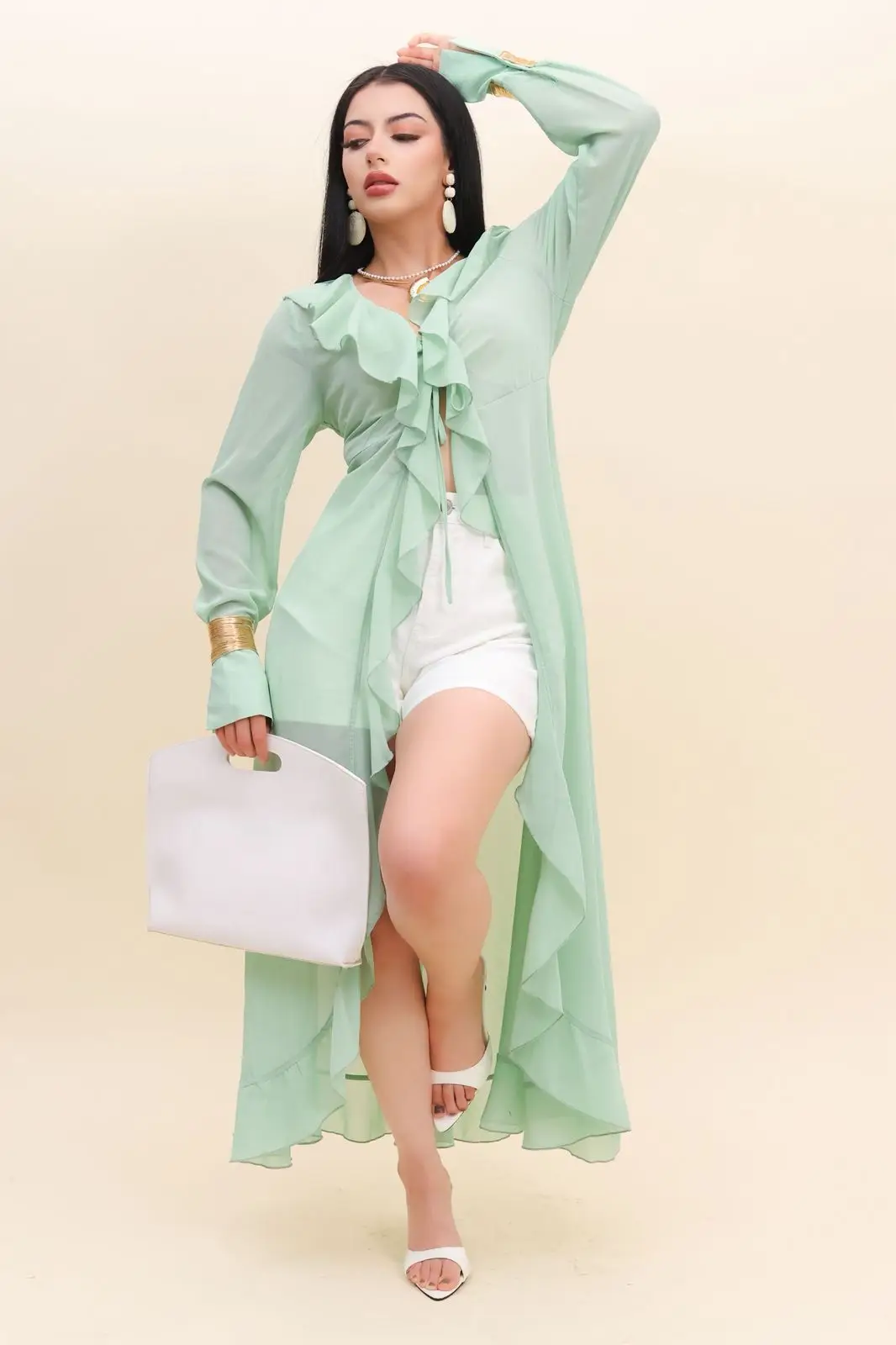 CARDIGA HSL4685 DE GASA MARROQUI Conquista todas las miradas con este elegante kimono largo 🌿✨ Su diseño ligero y fluido destaca por los delicados olanes al frente, mangas largas y corte asimétrico que estiliza la figura. Cuenta con ajuste en la cintura que resalta la silueta de forma femenina y sofisticada. Ideal para combinar con shorts, jeans o vestidos y crear un look fresco, moderno y lleno de estilo 💚