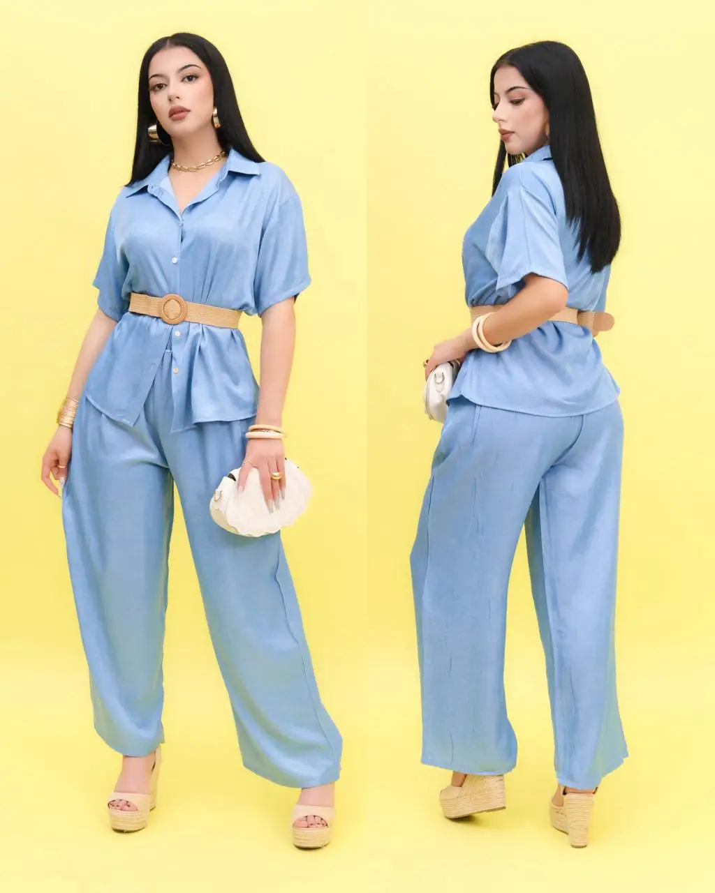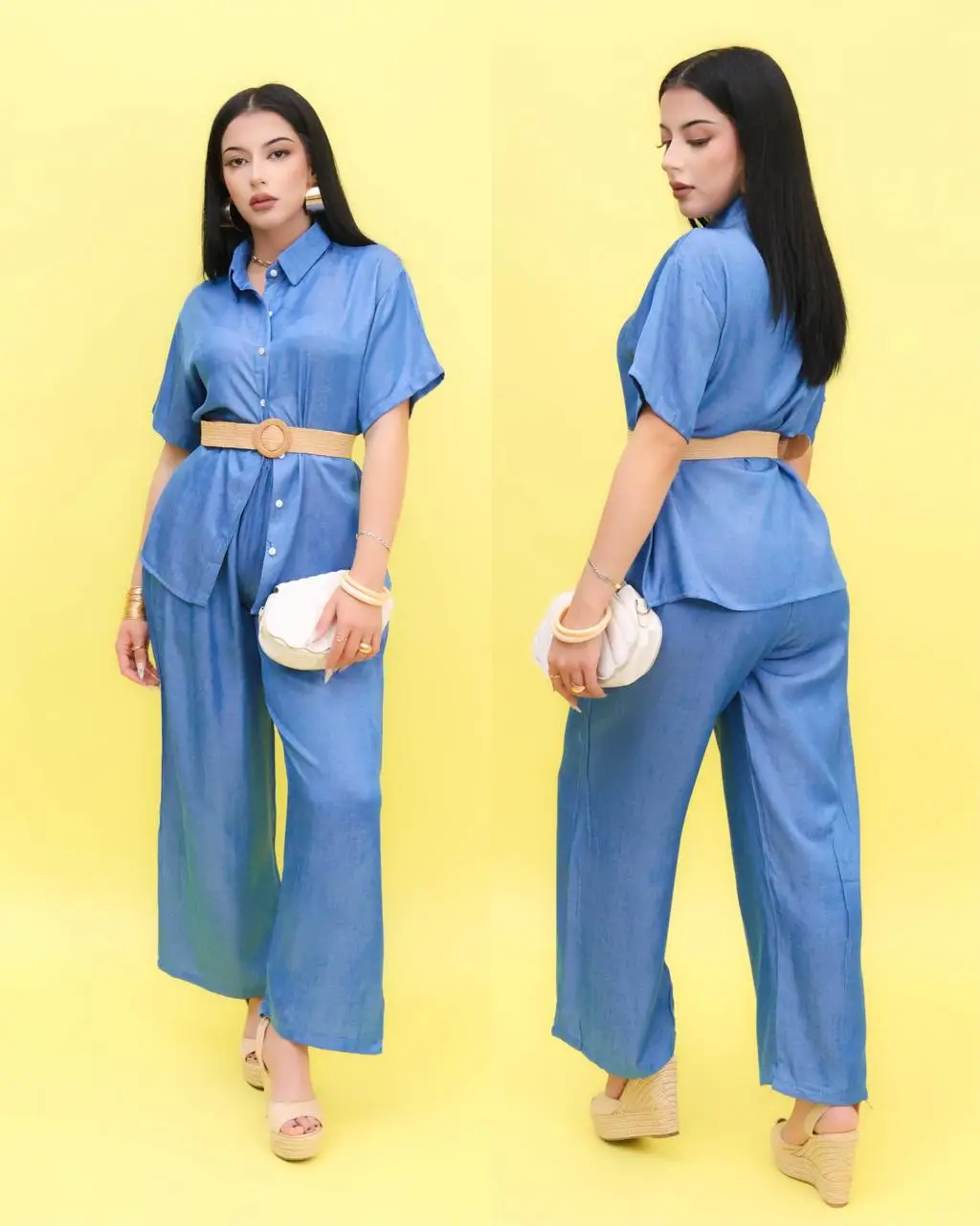 CONJUNTO: EE58009 DE LINO TONOS MEZCLILLA Conjunto femenino de dos piezas con un estilo moderno y relajado, ideal para lucir elegante sin sacrificar comodidad. Incluye blusa tipo camisera de manga corta con botones al frente, confeccionada en tela ligera con caída suave que aporta frescura y movimiento. El pantalón de corte amplio tipo palazzo estiliza la figura y brinda libertad al caminar, convirtiéndolo en una opción perfecta para climas cálidos. que marca la cintura y realza la silueta de forma favorecedora. Perfecto para outfits casuales chic, salidas de día o eventos informales donde quieras destacar con un look versátil, femenino…