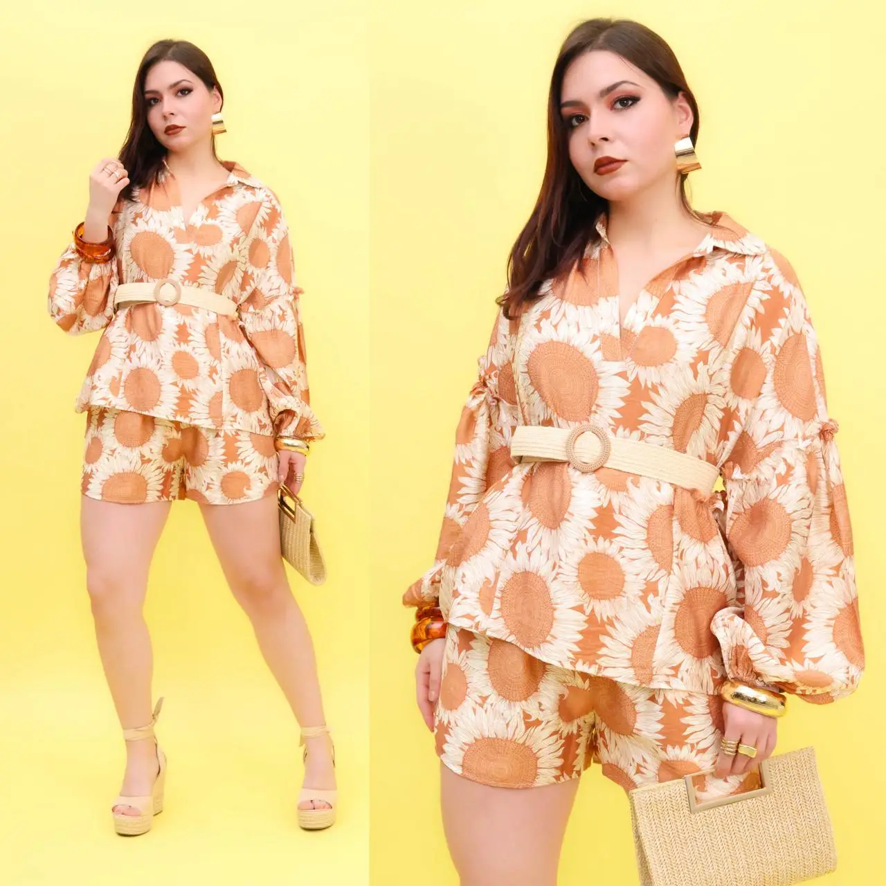 CONJUNTO DE CAMISOLA Y SHORT DE LINO-OCEAN ESTAMPADO DE GIRASOLES.