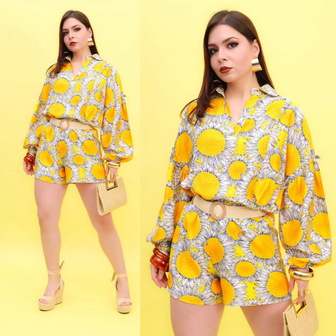 CONJUNTO DE CAMISOLA Y SHORT DE LINO-OCEAN ESTAMPADO DE GIRASOLES. UNA PRENDA IDEAL PARA ESTE VERANO LIGERO Y COMODO UN DISEÑO INOVADOR Y MUY PLAYERO