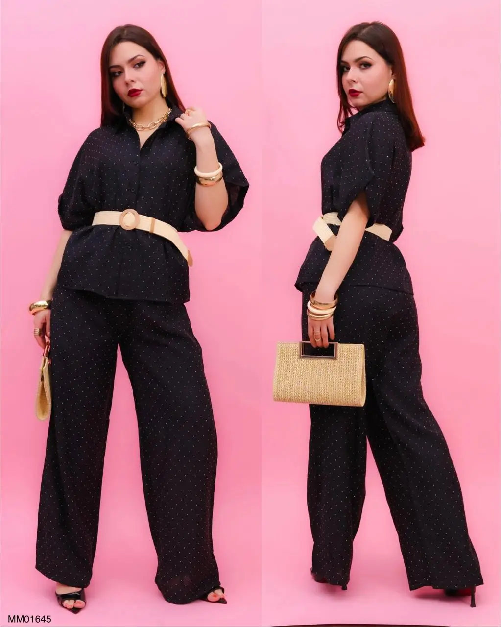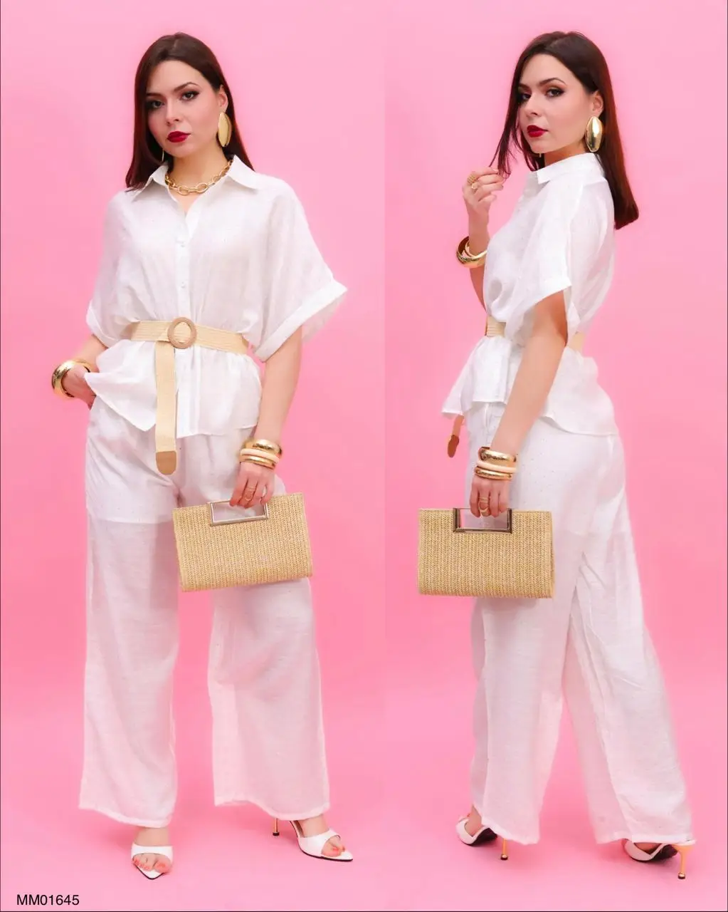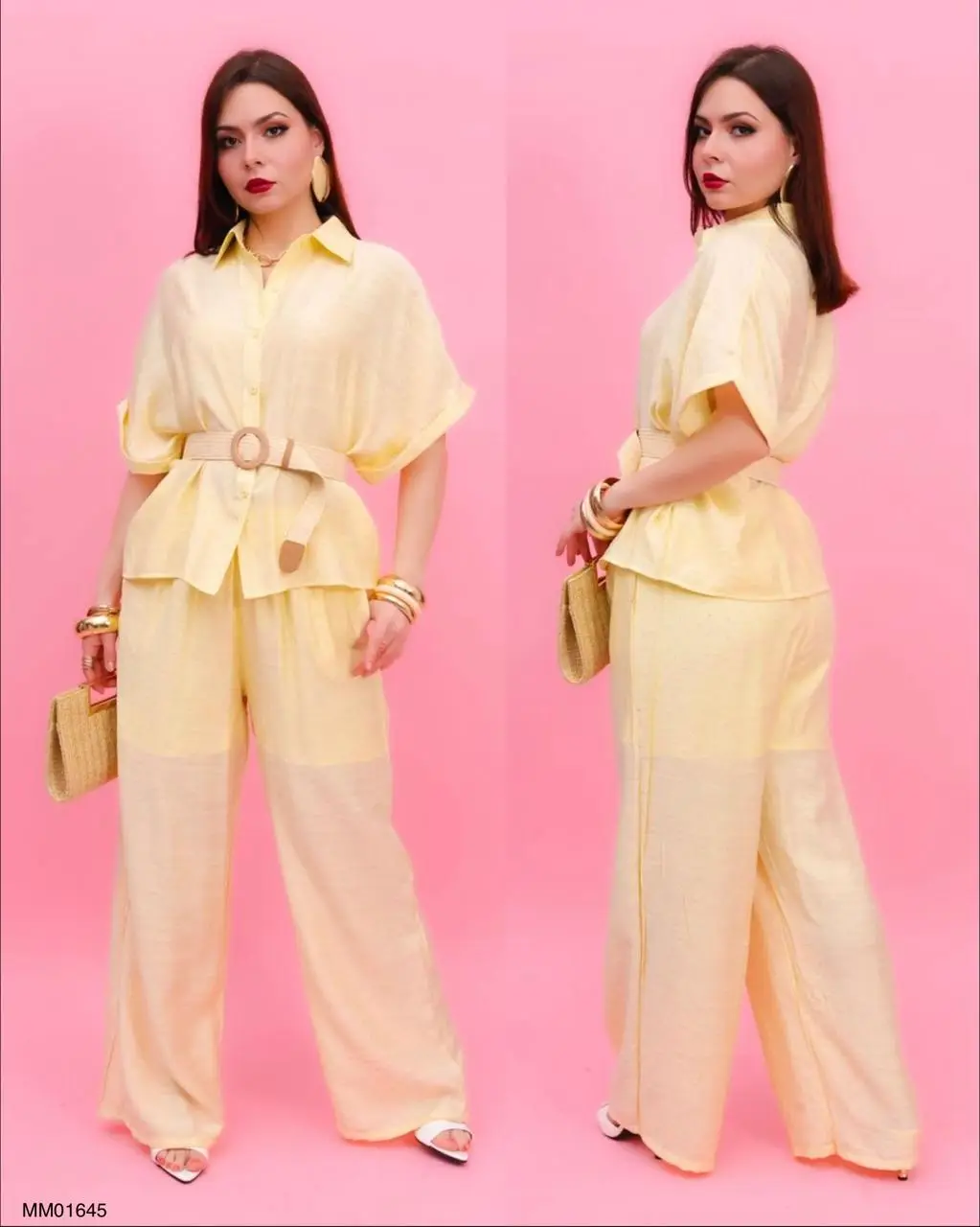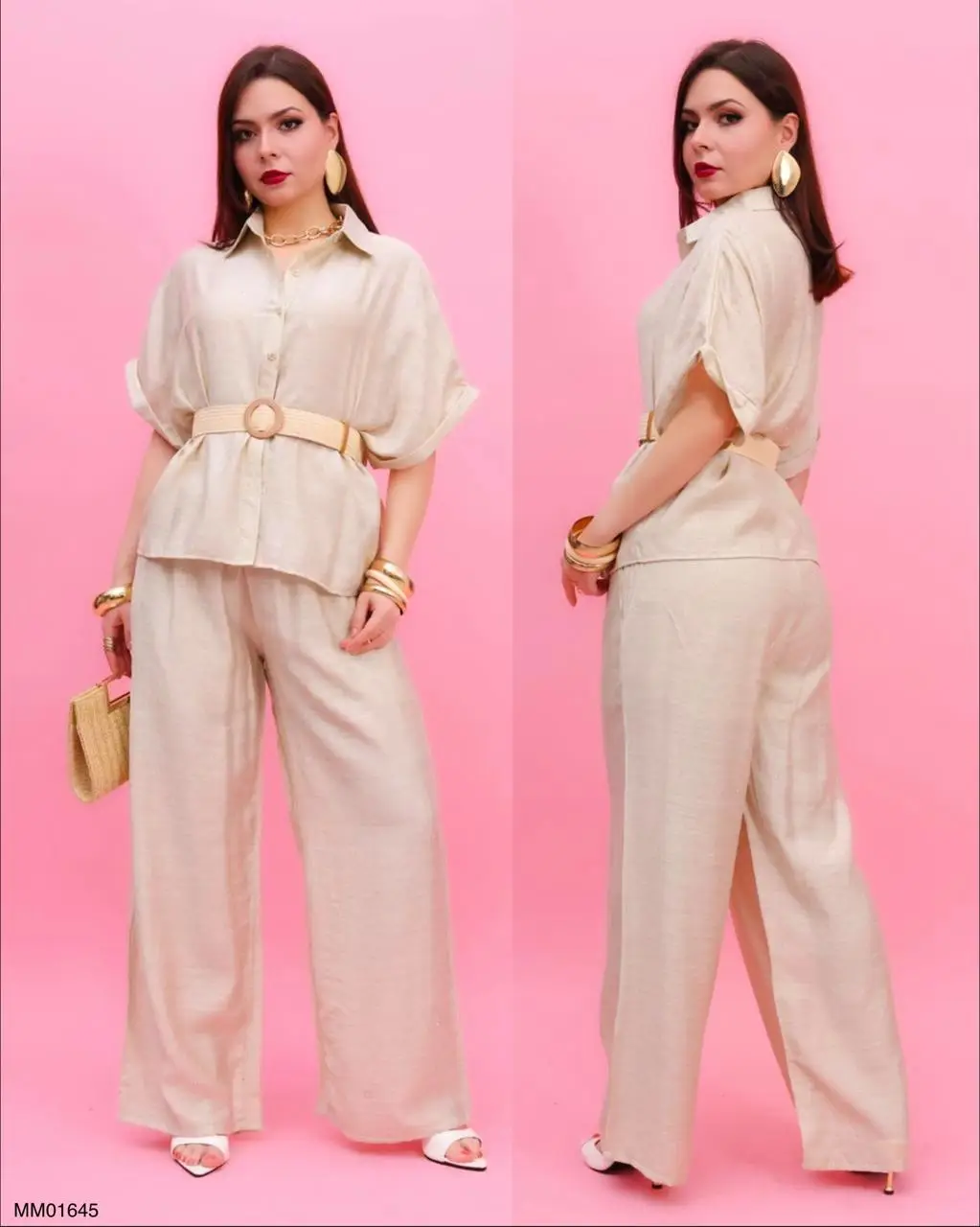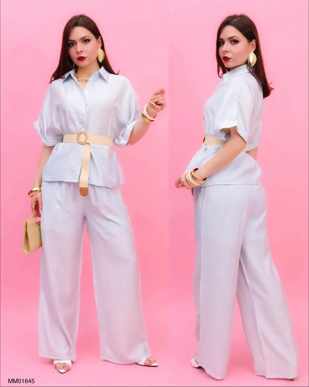 CONJUNTO: MM01645 COORDINADO DE LINO FRESH BEACH Conjunto elegante y fresco, ideal para un look sofisticado y relajado. La blusa tipo camisera de corte amplio con manga corta aporta comodidad y estilo, mientras que el cinturón ajustable con hebilla circular define la silueta de manera favorecedora. El pantalón de pierna ancha complementa el outfit con un acabado fluido y ligero, perfecto para climas cálidos. Este modelo se distingue por su versatilidad, ya que puedes usarlo tanto para ocasiones casuales como para eventos más formales, combinándolo fácilmente con accesorios llamativos o minimalistas. Una opción moderna que equilibra comodidad, elegancia y tendencia.