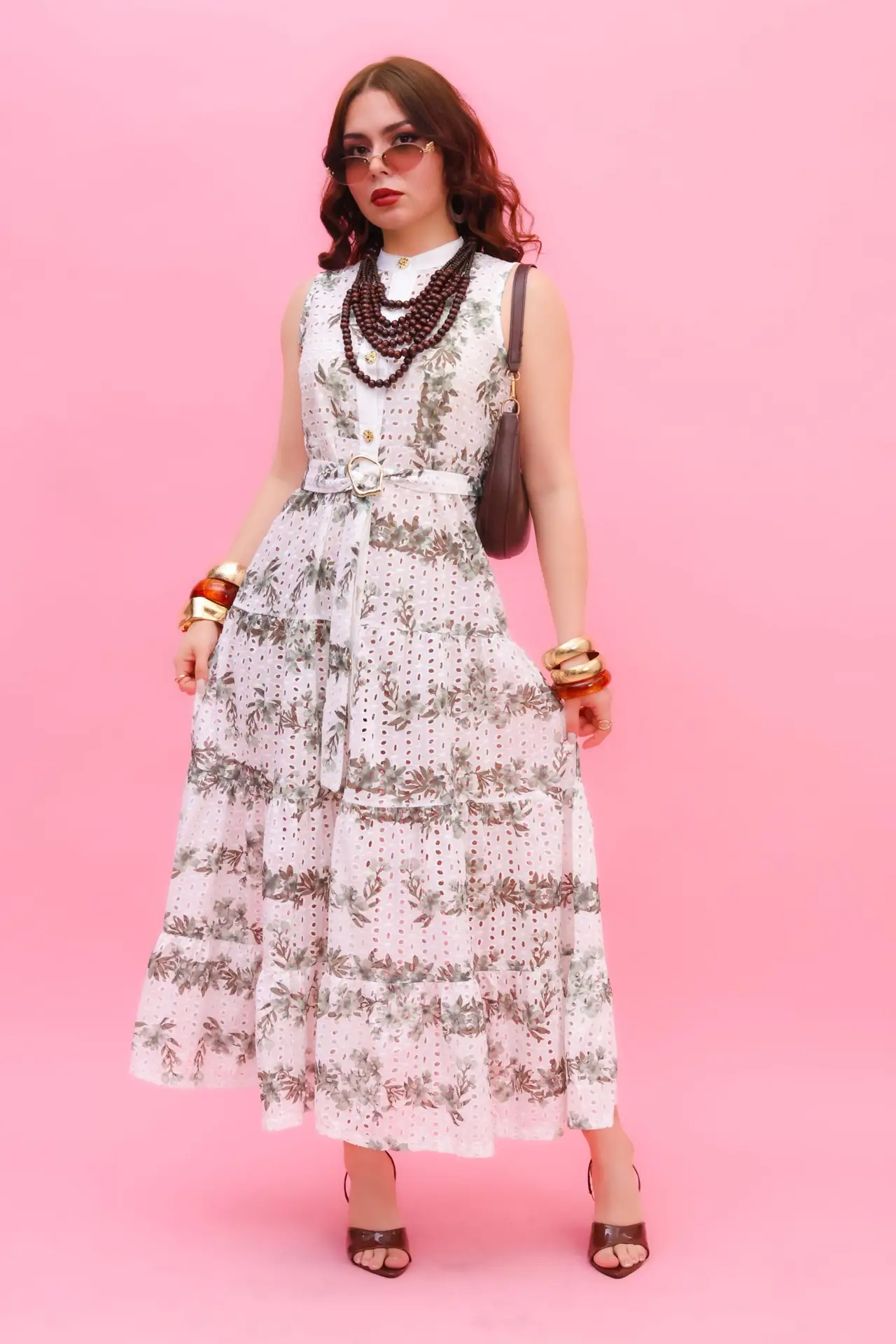 VESTIDO FLOREADO DE BATISTA BORDADA SIN MANGAS CON FAJILLO DE TELA.